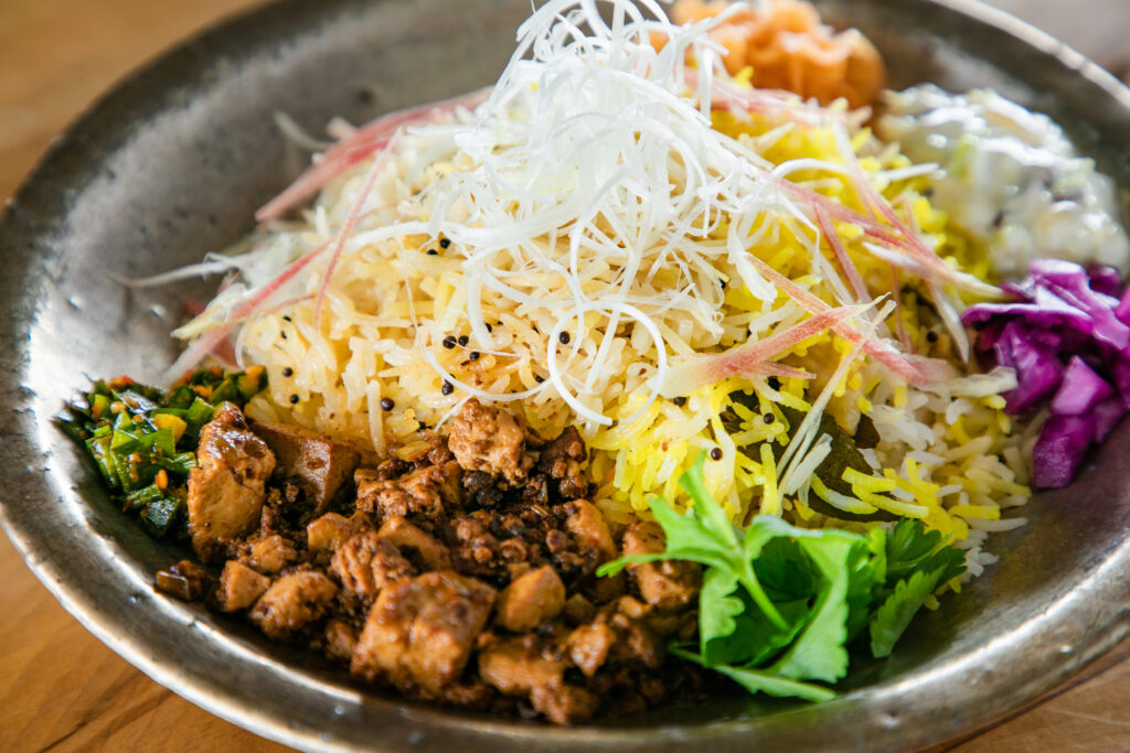 京都からやってきた「日本三大ビリヤニ」の一角。羽毛のようにふんわり炊き上がったバスマティライスに鯛出汁の旨味や旬食材を組み合わせた「京風創作ビリヤニ」が人気です。