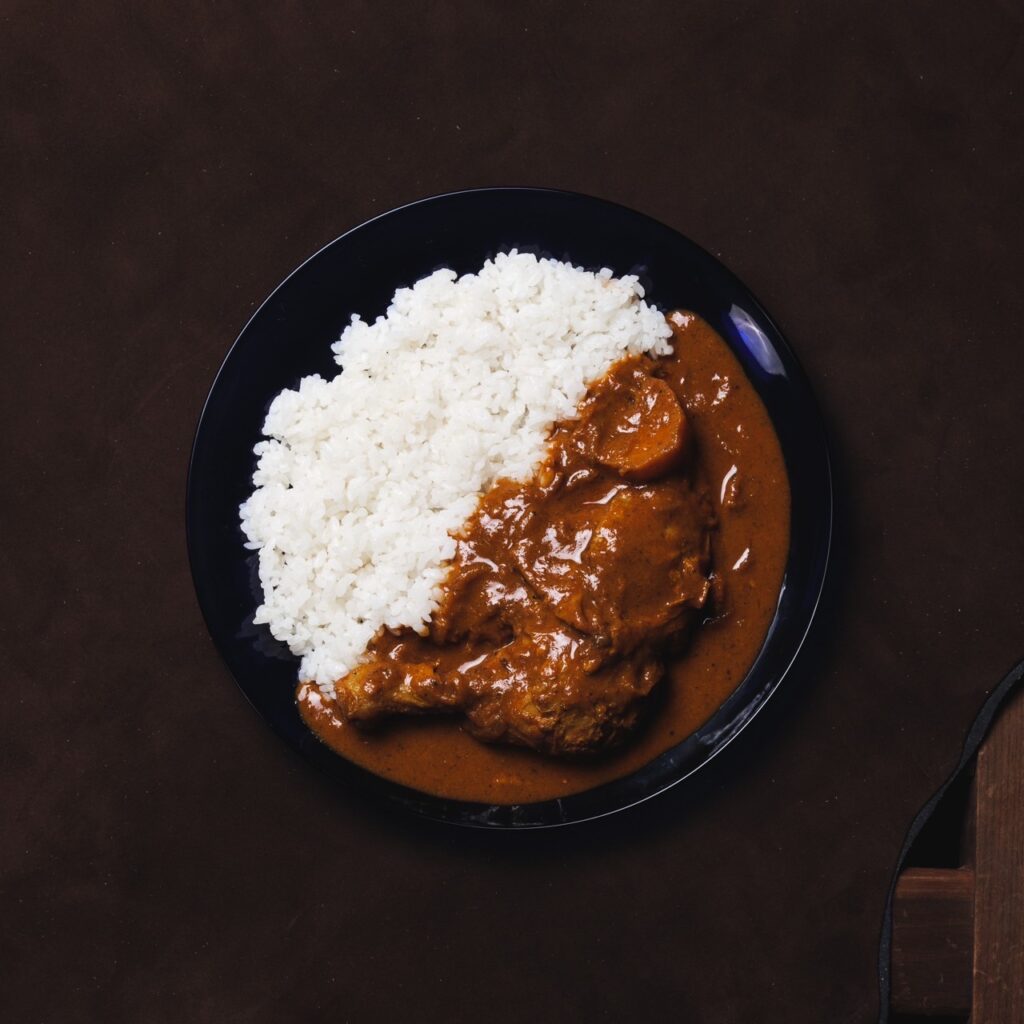 “しもふりレッド”をルーツに持つ宮城県産三元豚肩ロースを塊肉で。甘く柔らかな肉と、ローストスパイス香るスモーキーで辛口なブラックカレー。
