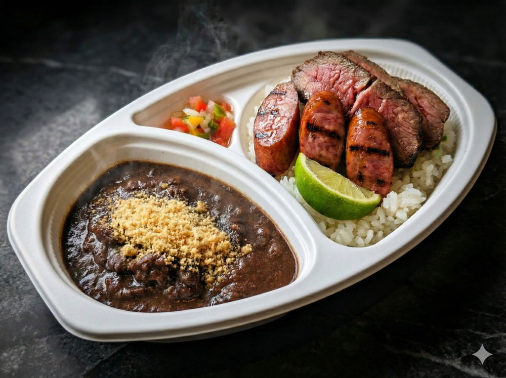 ブラジルの黒豆と肉の煮込み『フェイジョアーダ』の濃厚なコクを纏った漆黒のカレー。香ばしいシュラスコとソーセージを豪快にトッピングし、ライムと特製サルサで爽やかに味変。肉の暴力と酸味の調和を味わう至高の一皿!
